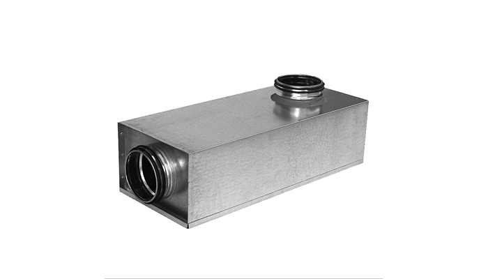 Kompaktní čtyřhranný tlumič hluku s kruhovým napojením, s velmi dobrým útlumem.