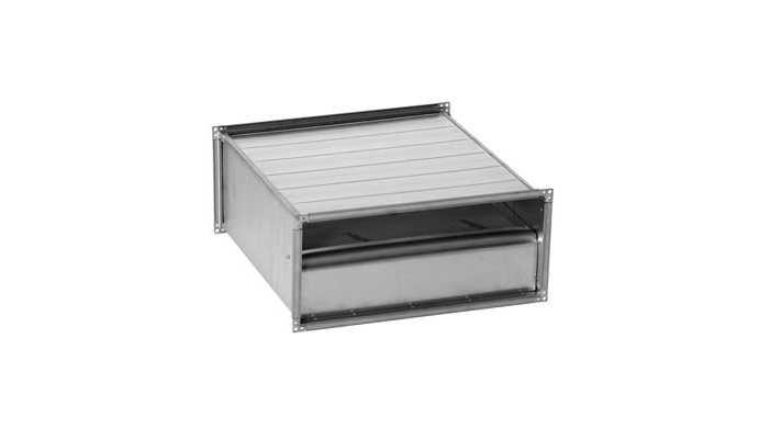 Čtyřhranný tlumič s nízkou instalační výškou.